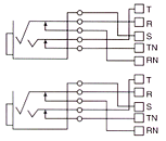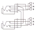Half-Normalled: In a half normalled configuration, the normals of the bottom jack are internally wired to the tip (T) and ring (R) connections of the to jack, and the tip, ring, and sleeve of both jacks are brought out to the rear terminations, creating a normal circuit. Inserting a plug into the top jack monitors the circuit without breaking it, and inserting a plug into the bottom jack breaks the circuit. |