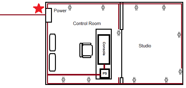 Attached to this ground point is a copper strap of 2" to 4" wide. It runs along with your audio wiring. As you populate your studio make sure the flow of ground is outward from the ground point to the furthest point, the studio. Try not to loop around or take extension cords from the studio outlets back to equipment on the left wall. The brown line shows my power flow. Try to keep circuits separate, such as the board on one breaker, your monitor amps on another breaker, machines on a third, and give the studio separate breakers. That way when the bassman crashes his Hartke LH1000 and trips the breaker, the control room doesn't die. Also, keep studio lights separate from outlets. Grounds for audio should always flow with earth grounds. Rule of thumb for me is sources get ground connections. Meaning, mic consoles have pin 1 on the XLR grounded. If you're going from a D.A. to a tape deck, the deck input is grounded. The ground wire to the D.A. output is open. Sources: